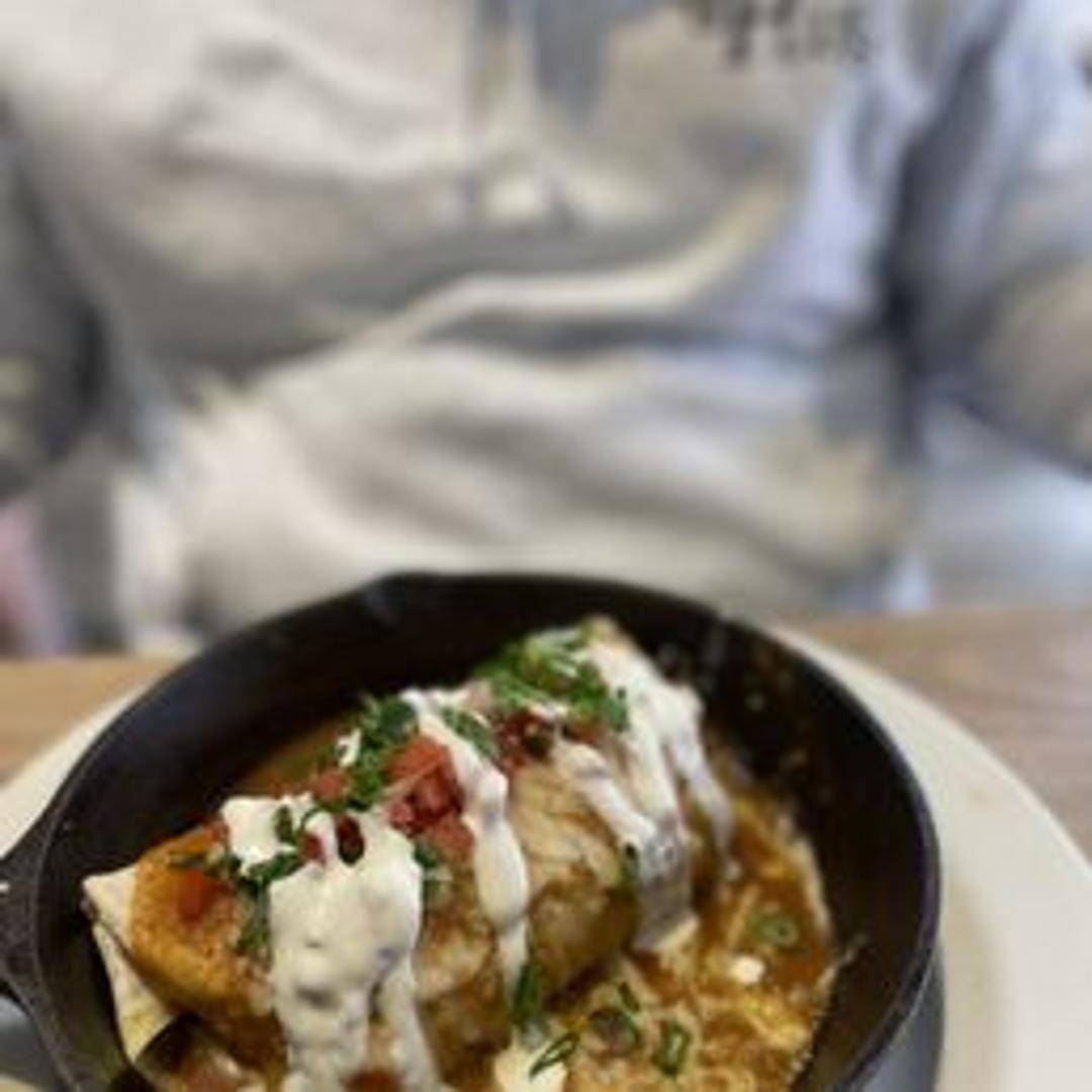 A hearty breakfast burrito filled with scrambled eggs, cheese, potatoes, and your choice of meat (such as bacon, sausage, or chorizo). Wrapped in a warm flour tortilla.
