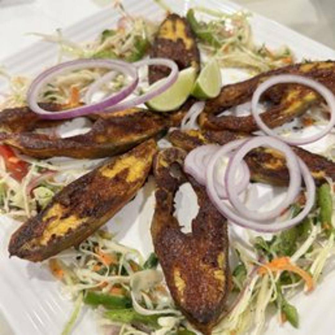 Fish fillets marinated in a blend of spices and shallow-fried on a flat griddle (tawa). A flavorful and slightly crispy dish, often served with lemon wedges and mint chutney.