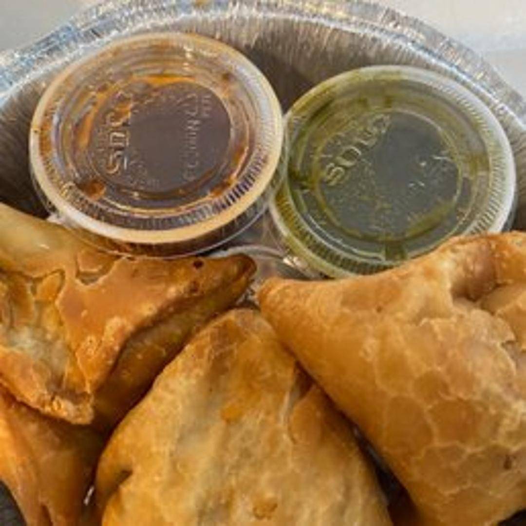 Crispy, golden-brown pastry pockets filled with a savory mixture of spiced potatoes, peas, and other vegetables. Served with a side of chutney for dipping.