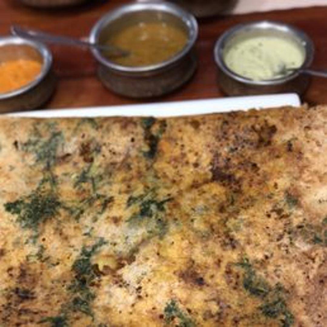 A crispy and savory South Indian crepe made from semolina (rava) batter, filled with a spiced potato and onion mixture. Served with sambar and coconut chutney.