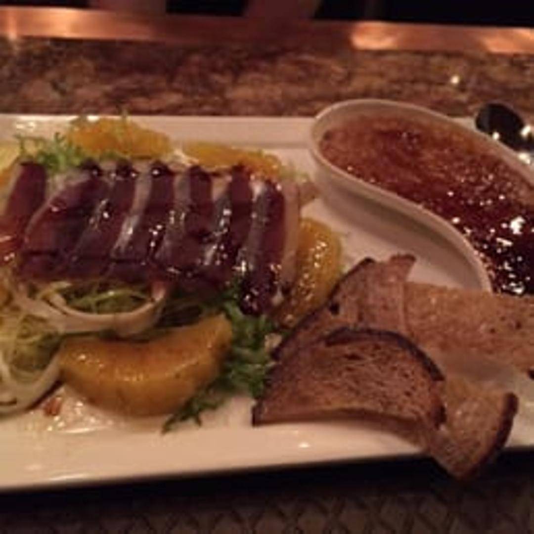 Thinly sliced cured duck breast, served with fig jam, crostini, and a balsamic glaze drizzle.