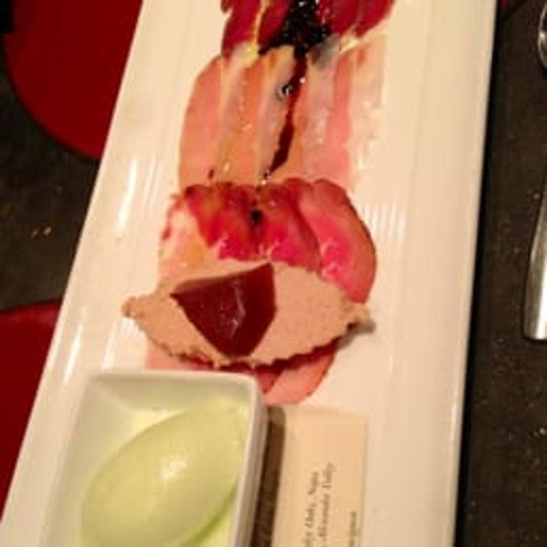 Pan-seared foie gras served atop brioche toast, accompanied by a port wine reduction and caramelized onions.