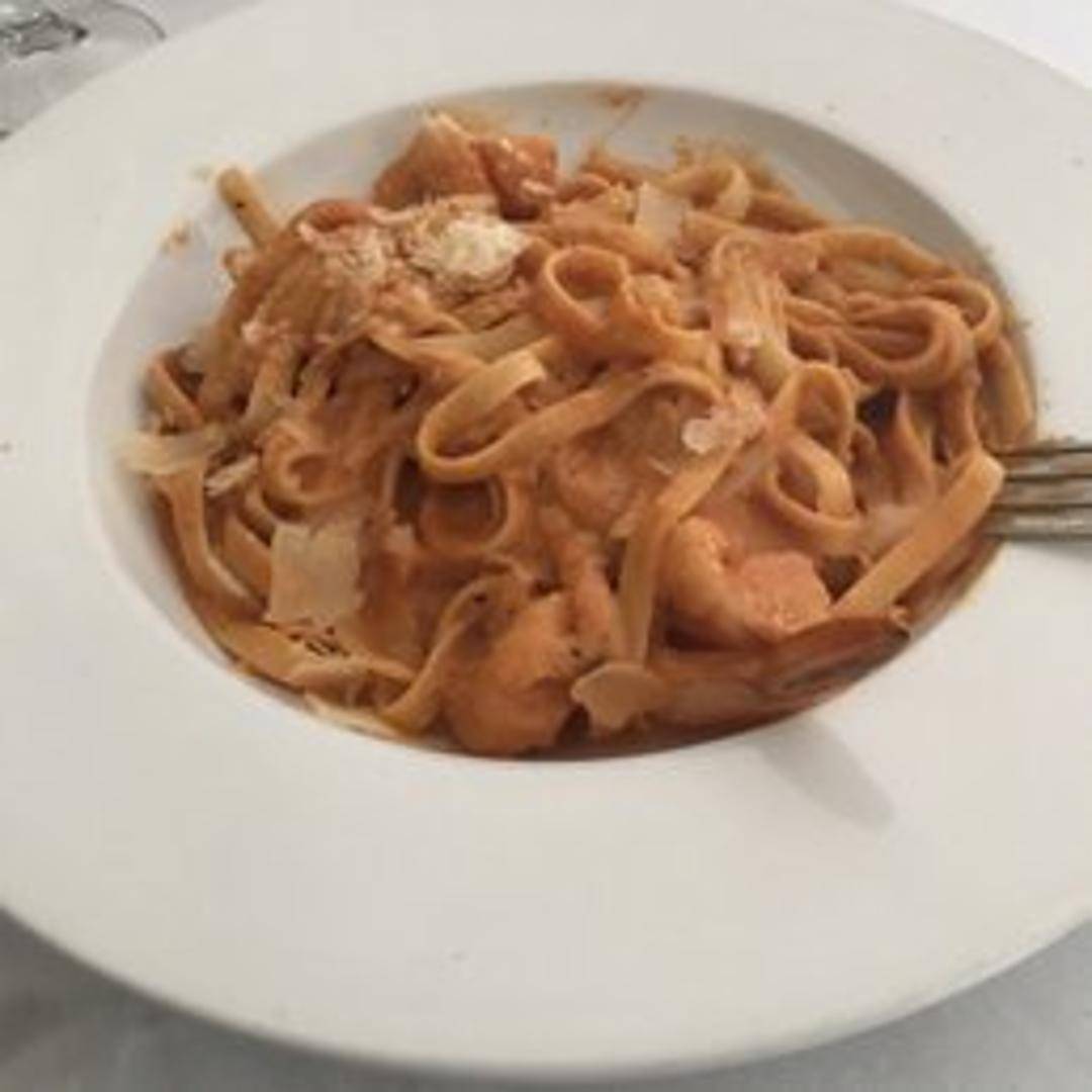 Fresh tagliatelle pasta tossed with succulent shrimp in a light and flavorful cream sauce, often featuring garlic, herbs, and a touch of white wine. Garnished with parmesan cheese and fresh parsley.