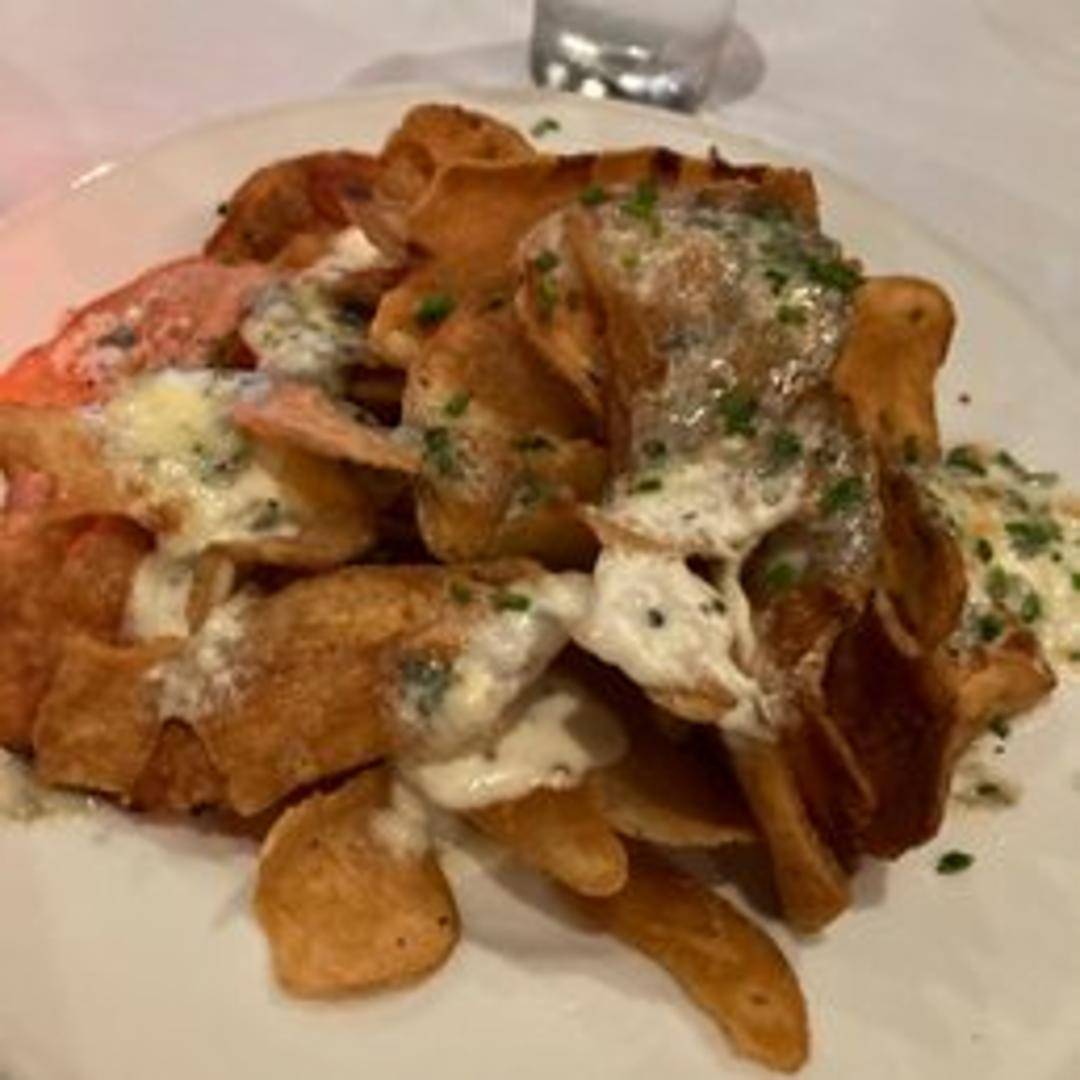 House-made potato chips drizzled with melted blue cheese and garnished with fresh herbs.