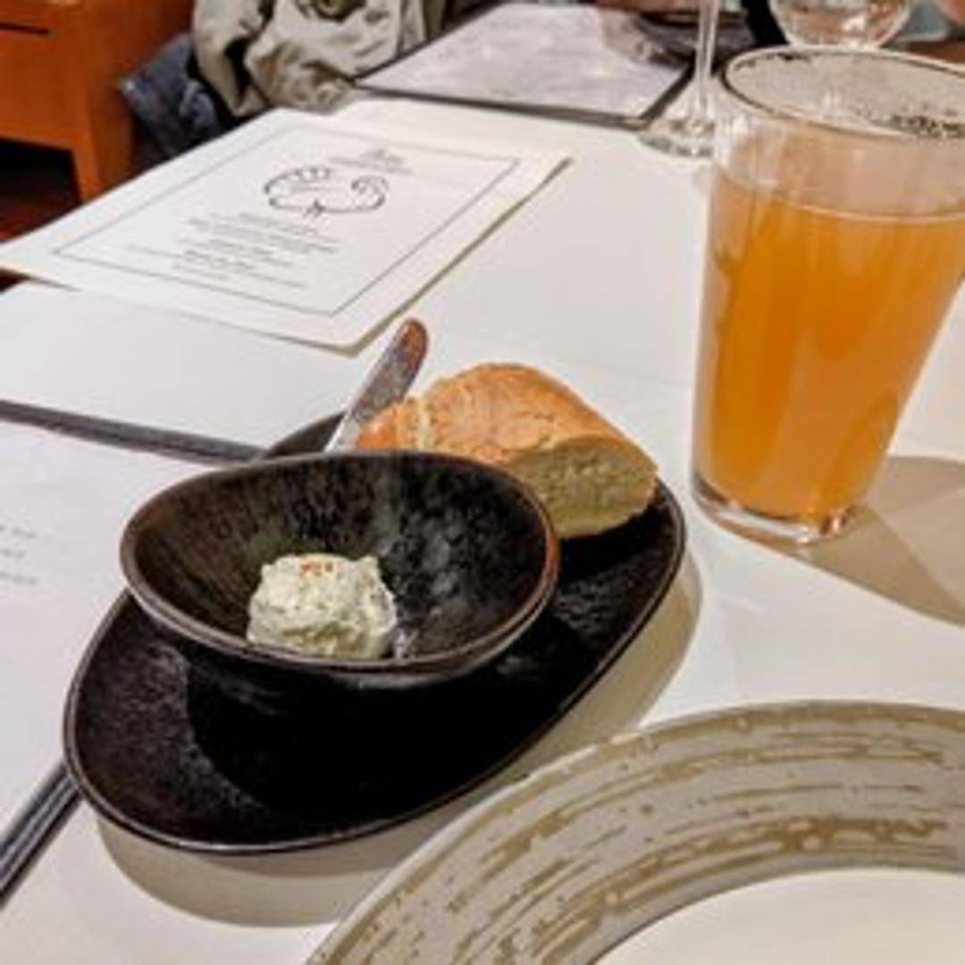 An inviting assortment of freshly baked breads, perfect for starting your meal. This basket typically includes a selection of artisanal breads, such as a crusty baguette, a rustic country bread, and possibly another daily specialty, all served warm. Accompanied by a generous portion of rich, creamy butter, it's designed to complement the French-inspired flavors of your dining experience.