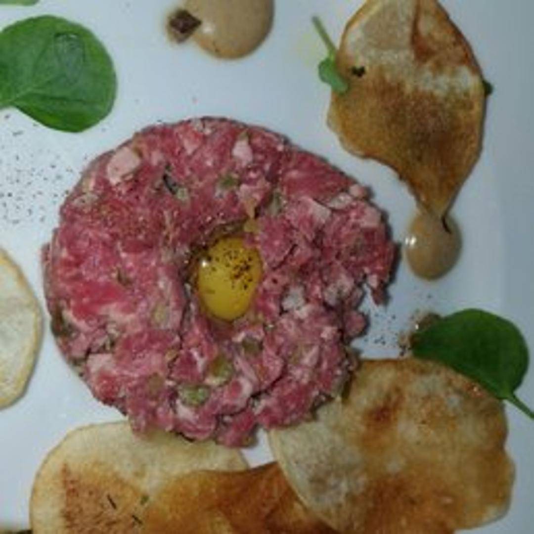 A classic French appetizer composed of finely hand-chopped raw lean beef, meticulously seasoned and mixed with traditional accompaniments such as capers, cornichons, shallots, and Dijon mustard. It is typically presented with a fresh raw egg yolk on top, and served alongside toasted bread, crostini, or crispy frites, allowing for a fresh, bold, and customizable flavor profile.