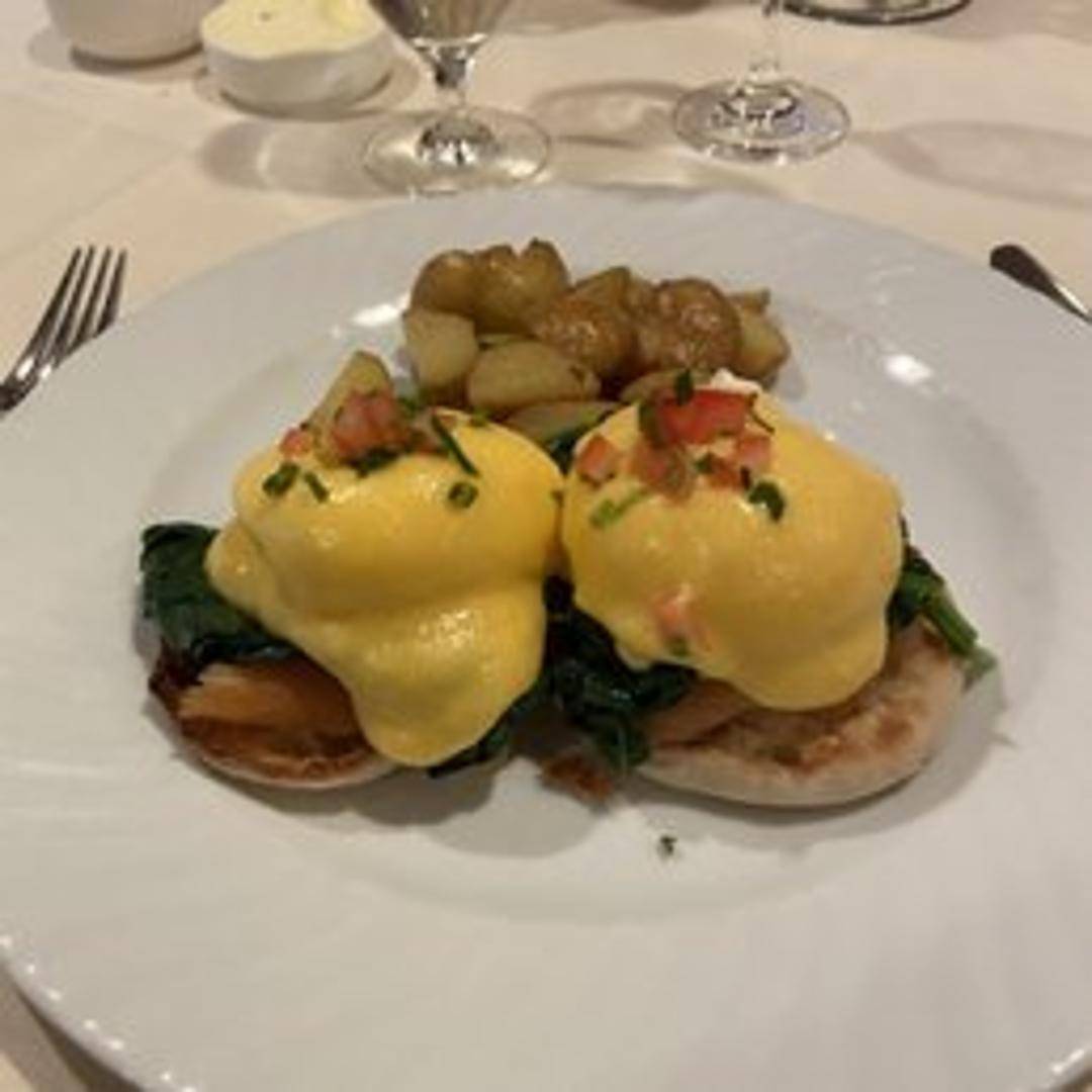 A timeless brunch classic featuring two perfectly poached eggs and slices of savory Canadian bacon, served atop a toasted English muffin. Drizzled generously with our velvety, house-made hollandaise sauce and a sprinkle of fresh chives.