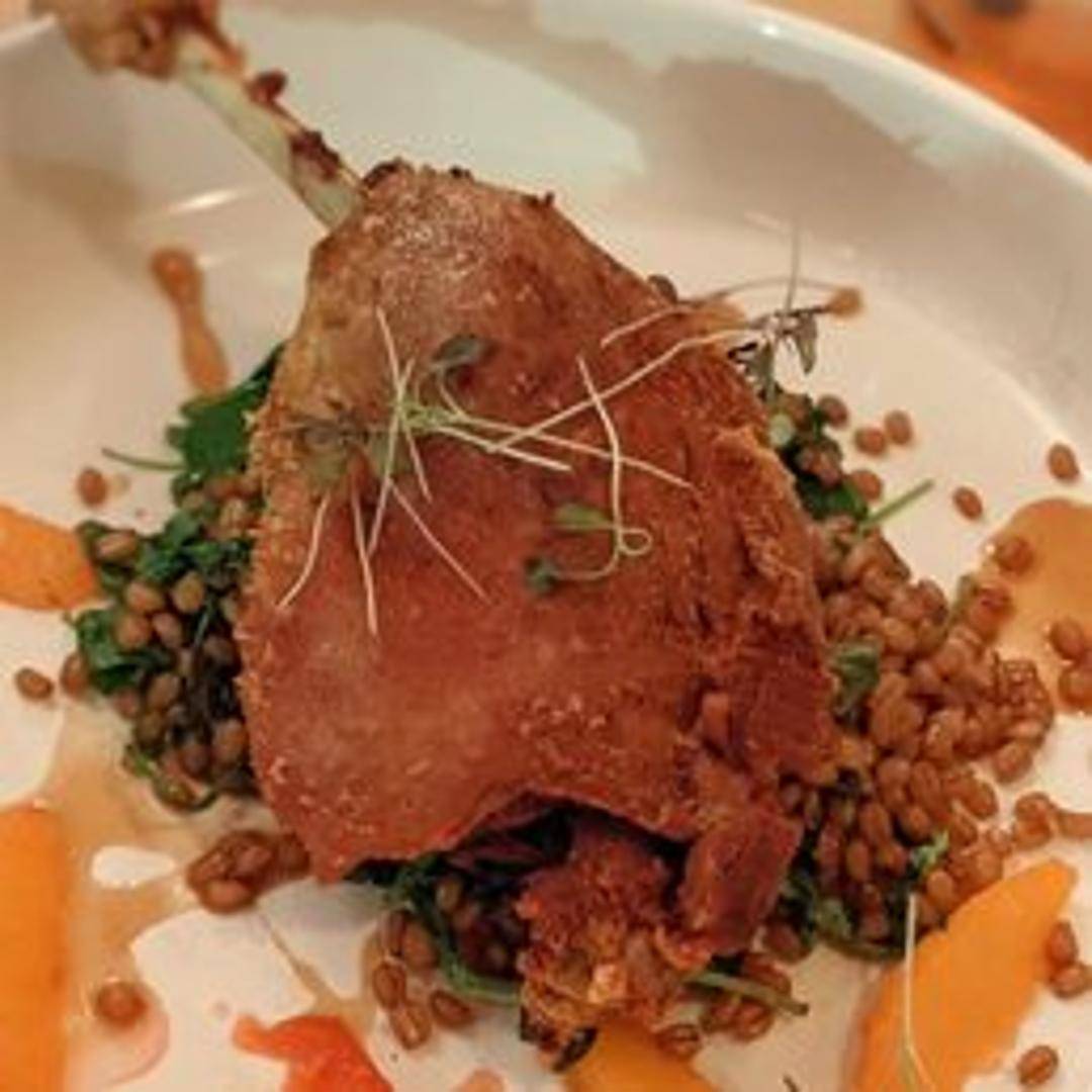 A savory pancake or flatbread topped with duck confit and an orange-infused sauce. The duck is slow-cooked in its own fat, resulting in tender and flavorful meat. The orange sauce provides a citrusy counterpoint to the richness of the duck.