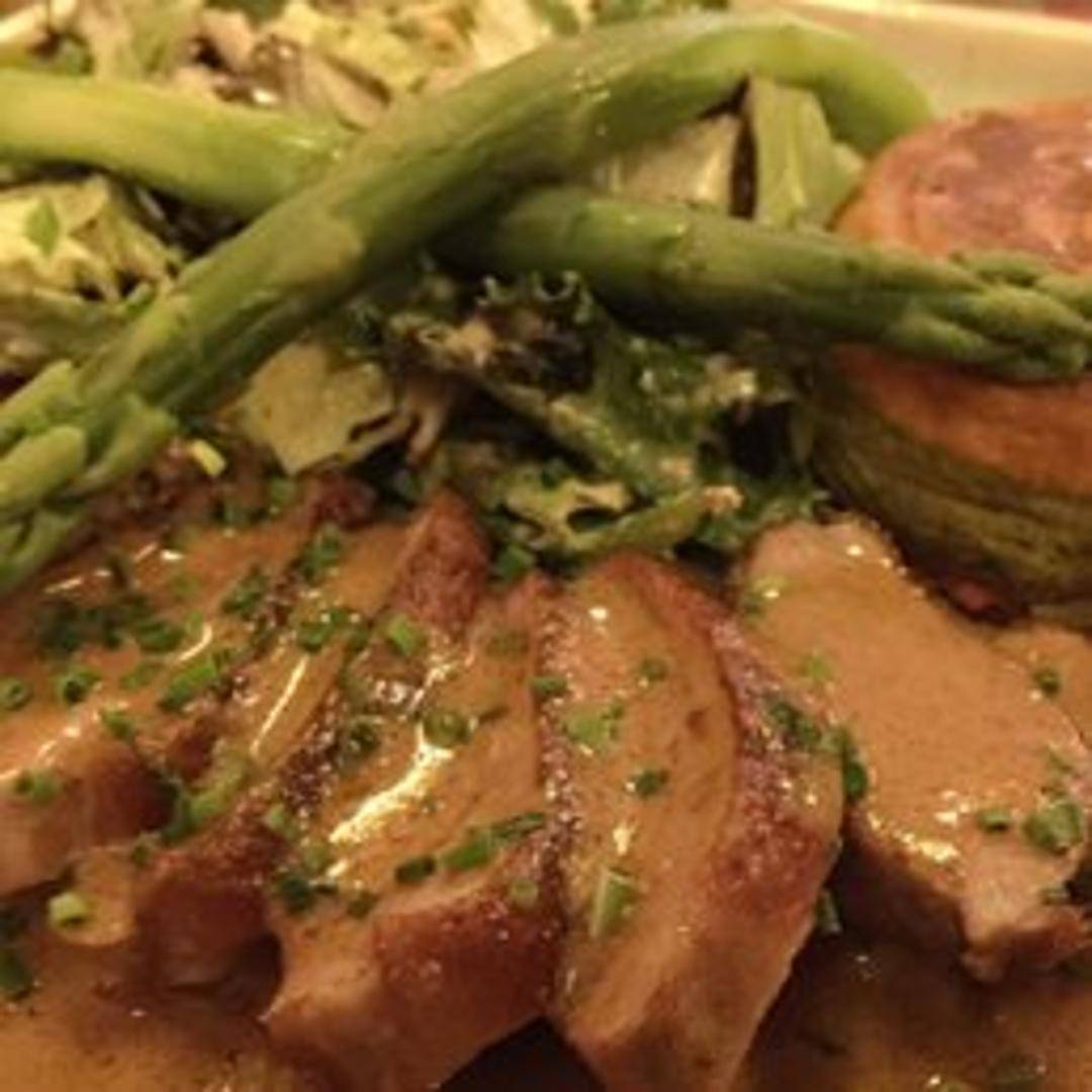 A perfectly pan-seared duck breast (Magret de Canard), cooked to a tender medium-rare, and served with a distinctive and aromatic green peppercorn sauce, offering a delightful balance of richness and piquant flavor.