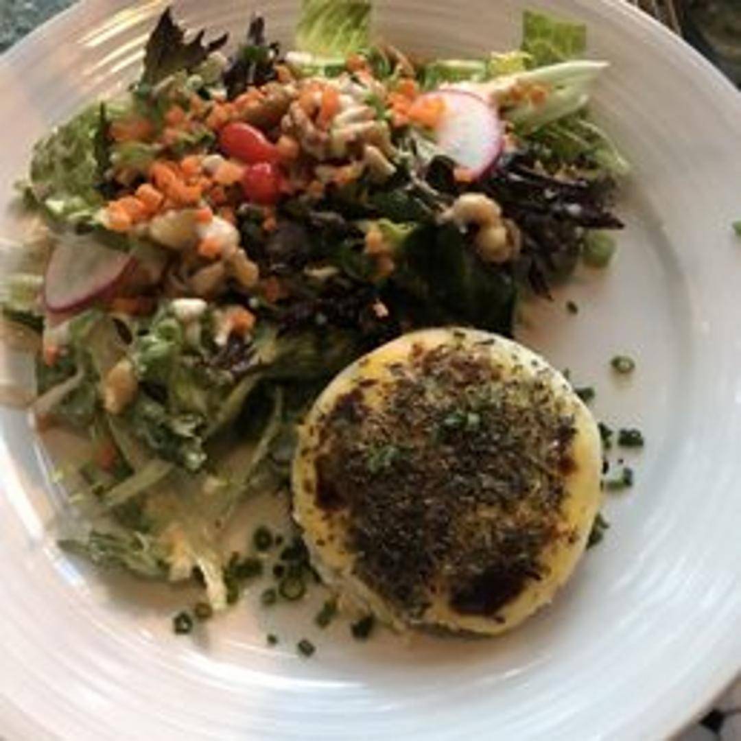 A fresh and vibrant salad featuring warm, crusted goat cheese served atop a bed of mixed greens, often accompanied by toasted walnuts, crisp apple slices, and a light, tangy vinaigrette dressing. A classic French bistro starter that balances rich flavors with refreshing textures.