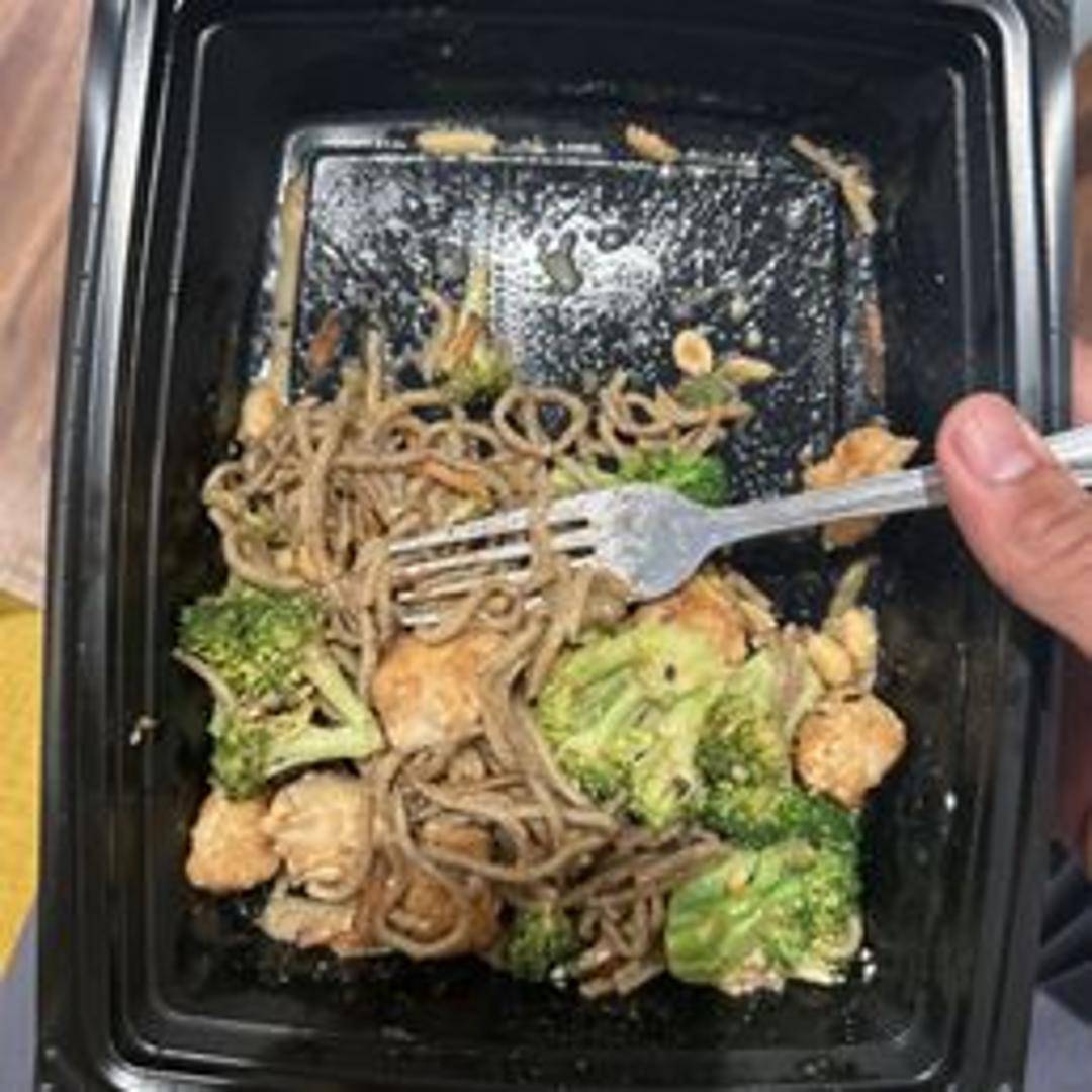 Soba noodles tossed in a spicy peanut sauce with grilled chicken, shredded carrots, cucumbers, green onions, and cilantro. Garnished with sesame seeds and crushed peanuts.