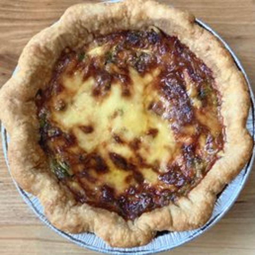 A savory baked tart consisting of a flaky, buttery crust filled with a rich and creamy custard. The custard is typically made with eggs, cream, and cheese, and may contain a variety of other ingredients such as vegetables (like spinach, mushrooms, or roasted peppers), meats (like bacon, ham, or sausage), or herbs. The specific ingredients vary, but the result is a flavorful and satisfying dish that can be enjoyed warm or cold. Contains gluten, dairy and eggs. Please inquire about today's specific flavor.
