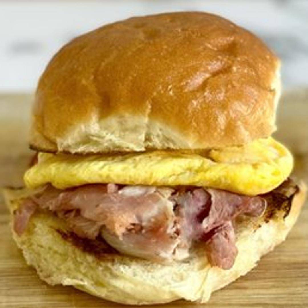 A hearty breakfast sandwich featuring your choice of freshly baked bread or roll, layered with scrambled eggs, melted cheese (cheddar, gruyere, or provolone options available), and your choice of breakfast meat (bacon, sausage, or ham). Prepared fresh daily with locally sourced ingredients.