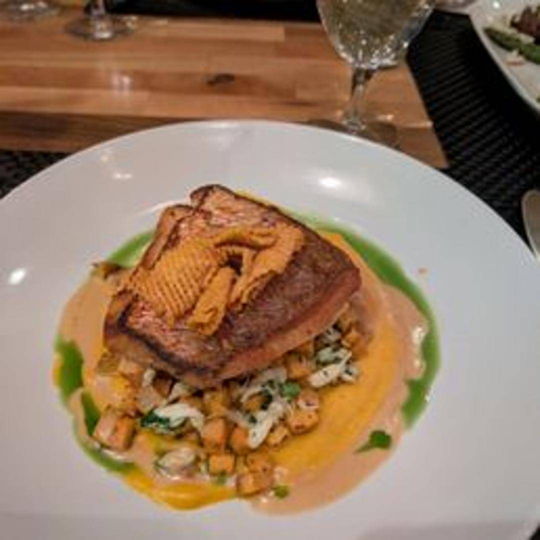 A flaky and mild white fish, prepared grilled, pan-seared, or baked. Often served with a complementary sauce or fresh herbs.