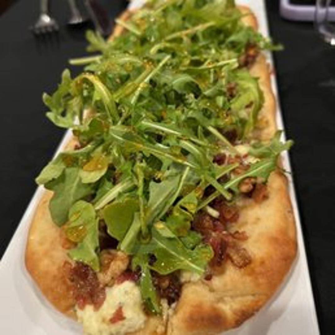 Crispy flatbread topped with crumbled bleu cheese, crispy bacon, caramelized onions, and a balsamic glaze. A savory and satisfying appetizer.