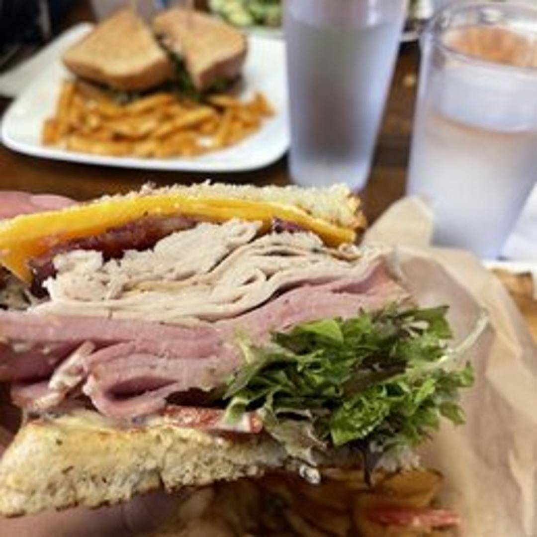 A triple-decker sandwich piled high with turkey, ham, bacon, lettuce, tomato, and mayonnaise on your choice of toasted bread.