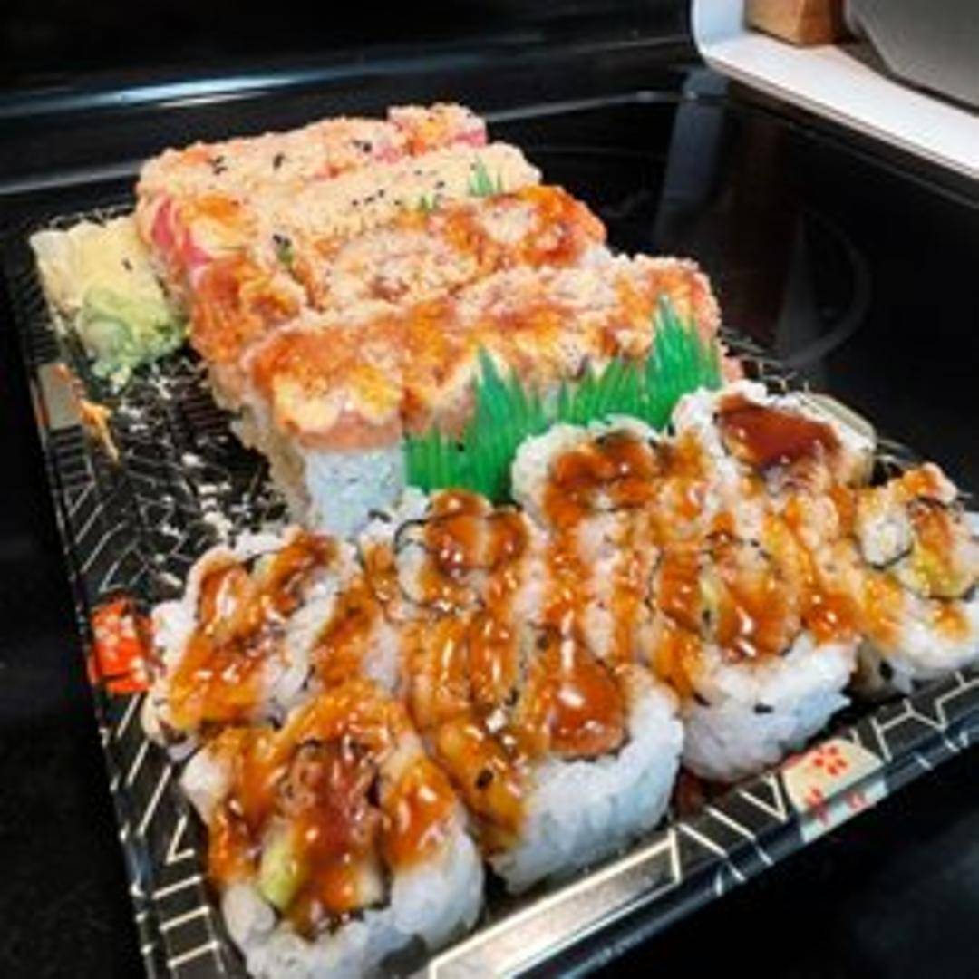 Sushi roll with tuna, spicy mayonnaise, cucumber, and avocado, wrapped in seaweed and rice. Topped with sesame seeds and served with soy sauce, ginger, and wasabi.