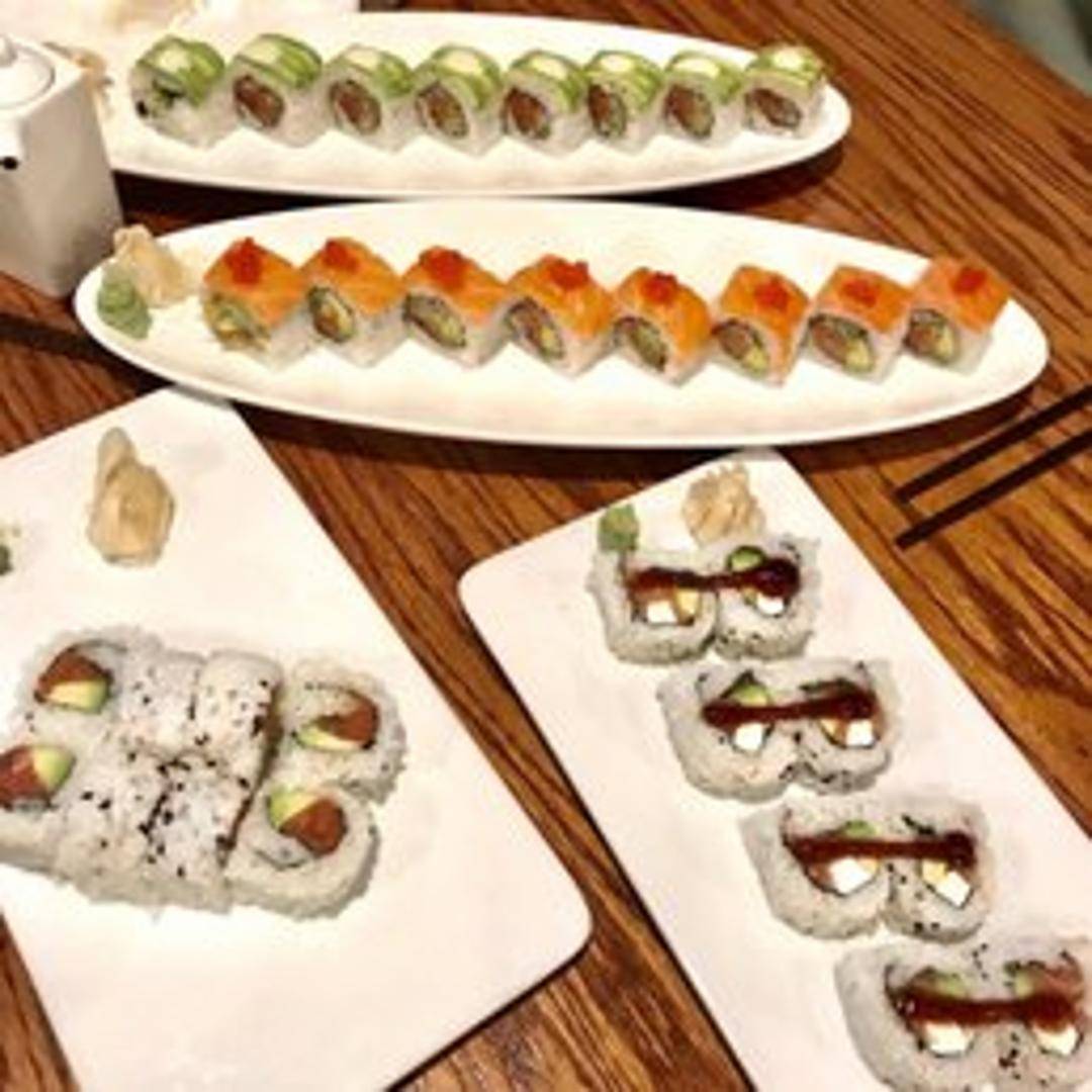 Sushi roll featuring salmon belly, avocado, and cucumber, wrapped in seaweed and rice. Topped with a special sauce and masago.