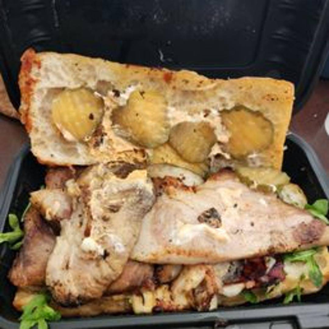 A pressed sandwich filled with Cuban pork, ham, Swiss cheese, pickles, and mustard. A classic Cuban delight.