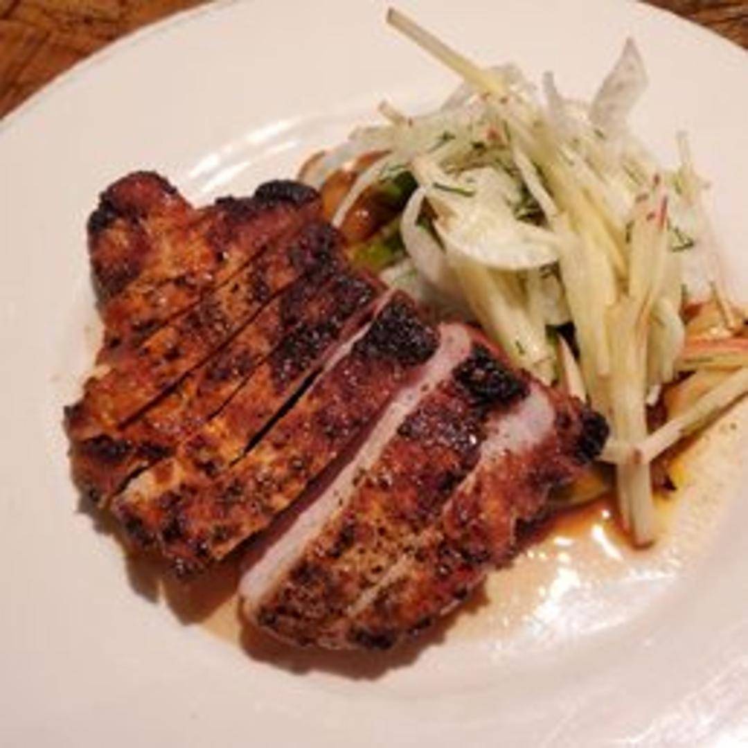 Roasted pork loin, seasoned with aromatic herbs and spices, offering a tender and flavorful pork dish. Served with complementary sides.
