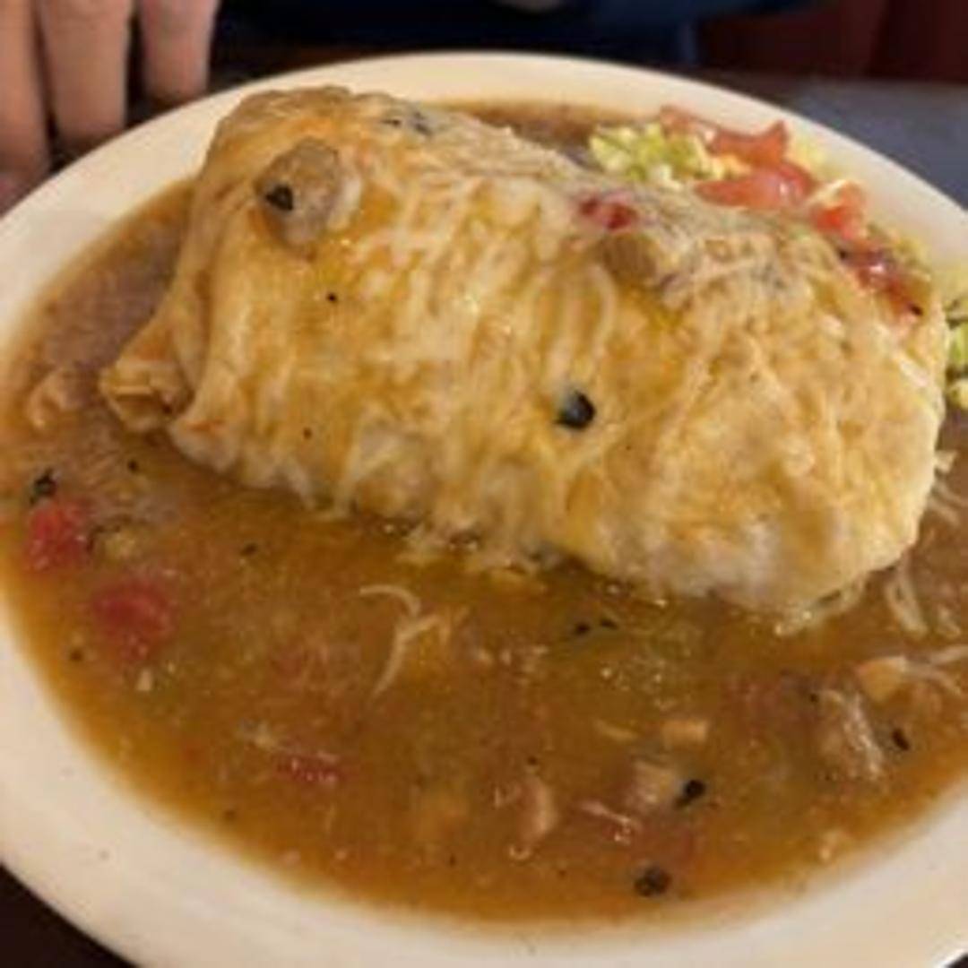 A large flour tortilla filled with your choice of filling (e.g., beans, meat, vegetables) and smothered in Blackbird Cafe's signature green chili. Topped with melted cheese.