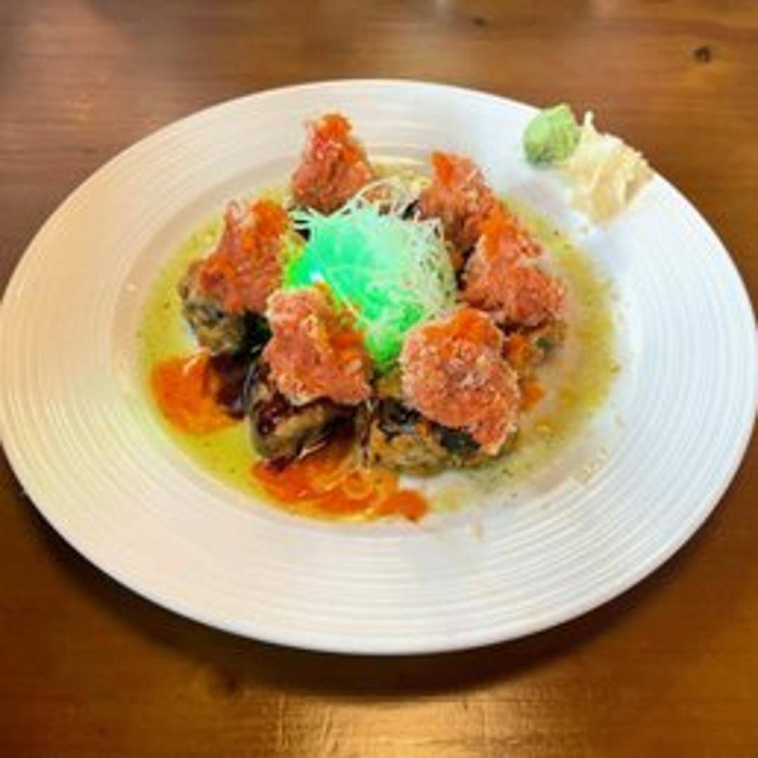 A fiery and flavorful sushi creation featuring a base of fresh seafood, crisp vegetables, and seasoned rice, generously topped with a rich, creamy, and often baked or seared spicy sauce that evokes the intense essence of a volcanic eruption.