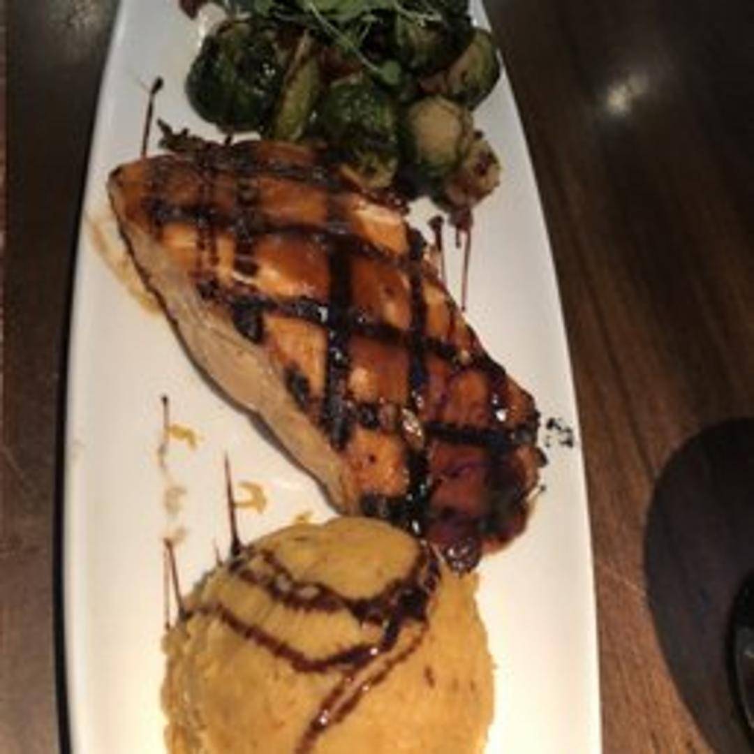 Freshly grilled salmon fillet, seasoned with herbs and spices, served with roasted vegetables and your choice of side.