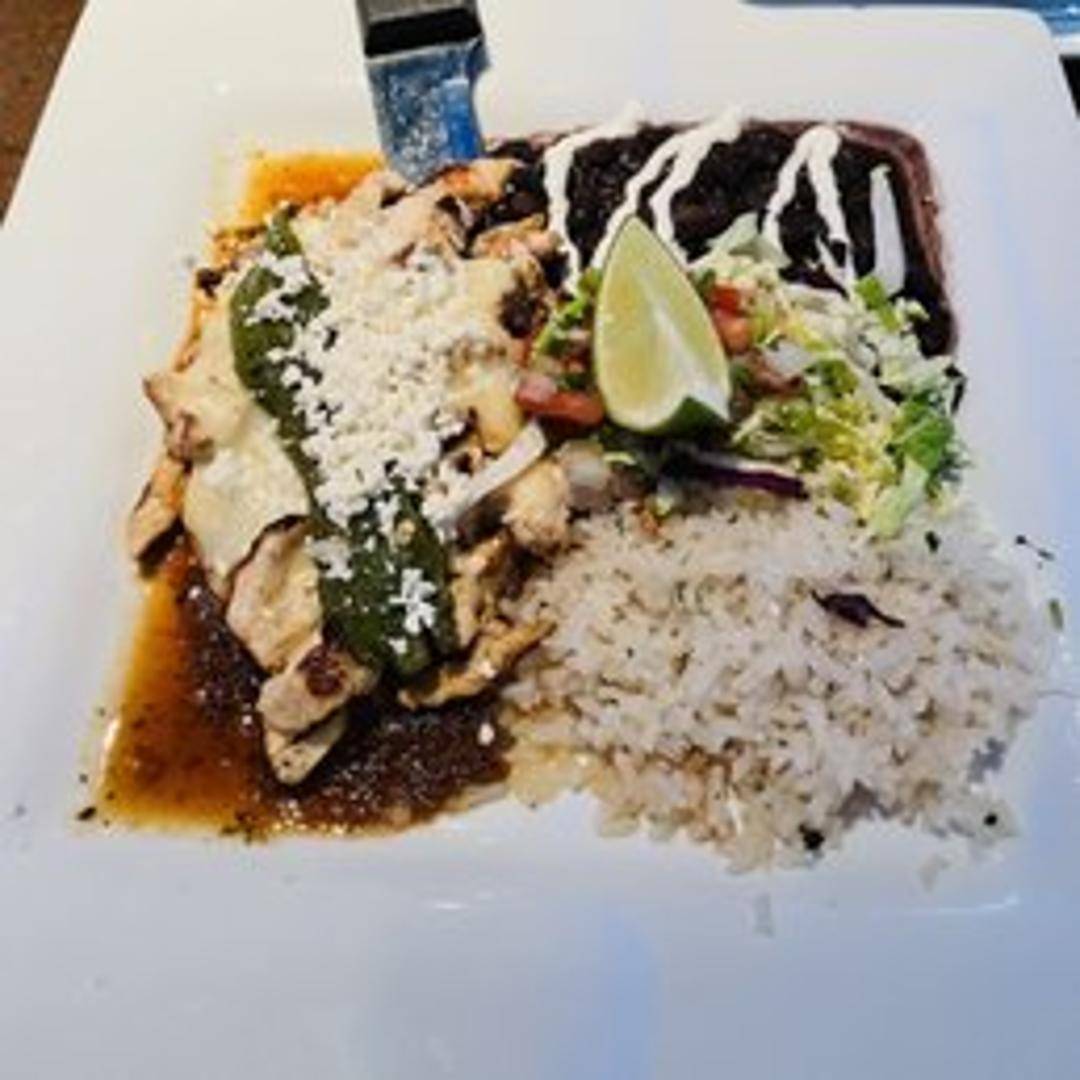 Grilled chicken breast marinated in tequila and lime, served with rice, beans, and your choice of tortillas.