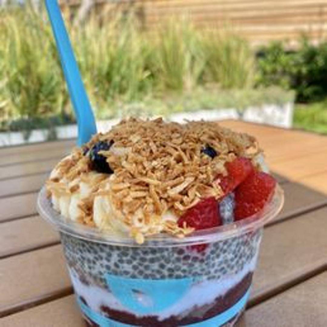A bowl with a base or topping featuring blue spirulina, giving it a vibrant blue color. Typically combines the tropical flavor of coconut with other fruits and toppings.