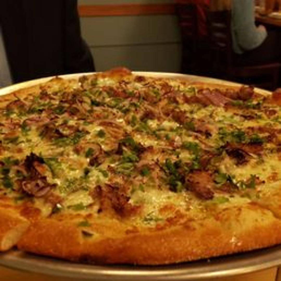 A decadent pizza featuring slow-cooked pulled pork, bacon, pineapple, red onion, and a tangy BBQ sauce base. Topped with a blend of cheeses and cilantro.