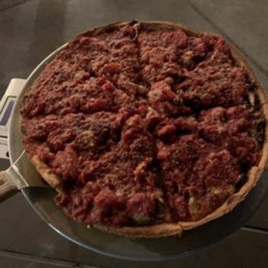 Chicago-style deep dish pizza with a thick, buttery crust. Loaded with layers of cheese, your choice of toppings, and a chunky tomato sauce on top.
