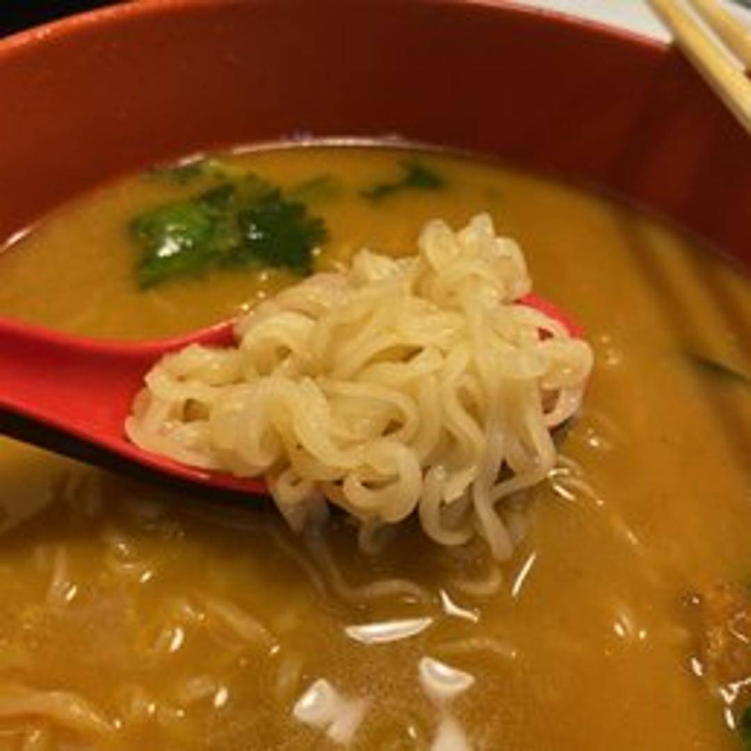 Savory ramen noodles in a spicy broth, topped with tender slices of seasoned chicken, nori seaweed, green onions, and a soft boiled egg. A flavorful and warming dish.