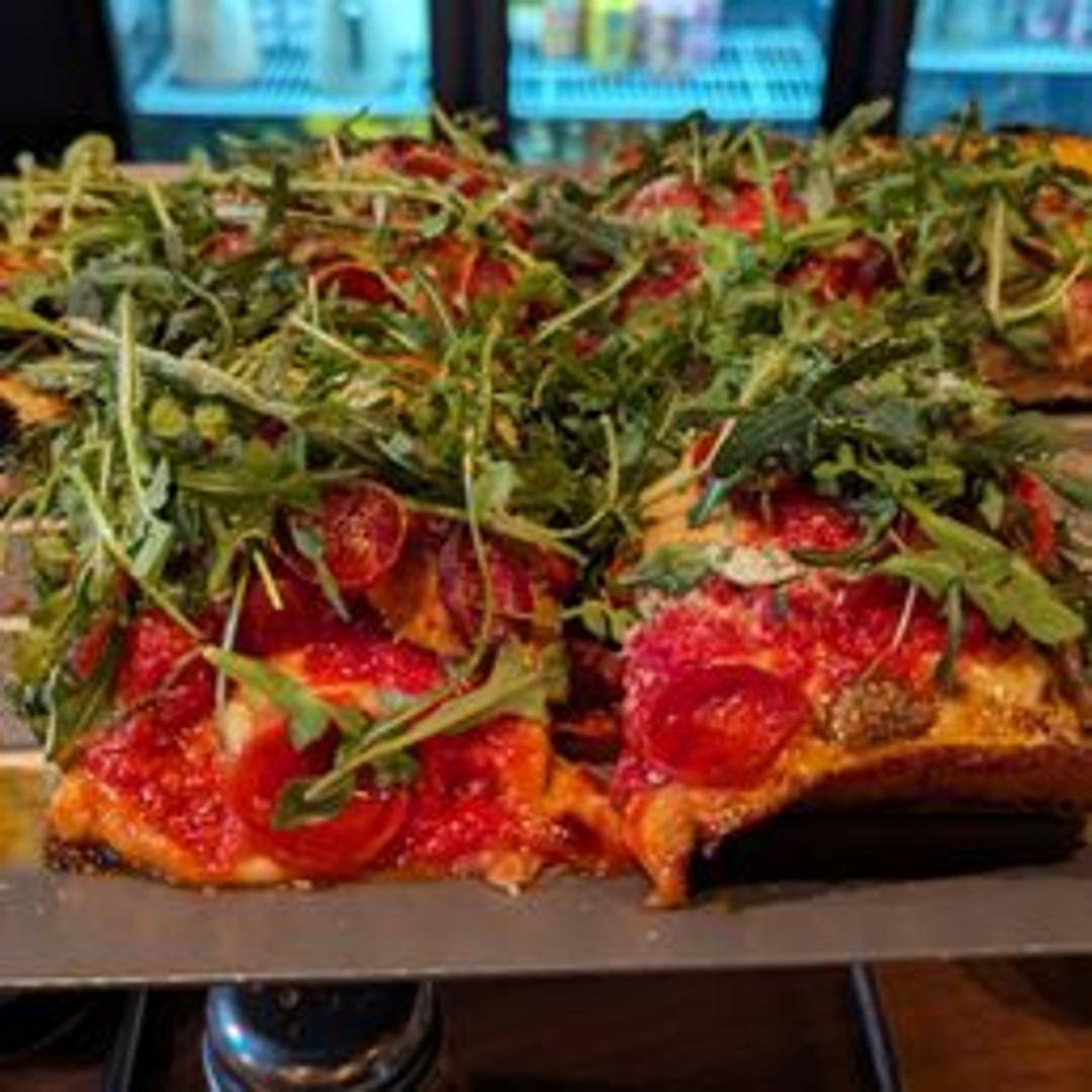 A thick, square pizza with a crispy, caramelized crust. Topped with brick cheese and a savory blend of pepperoni and sausage.
