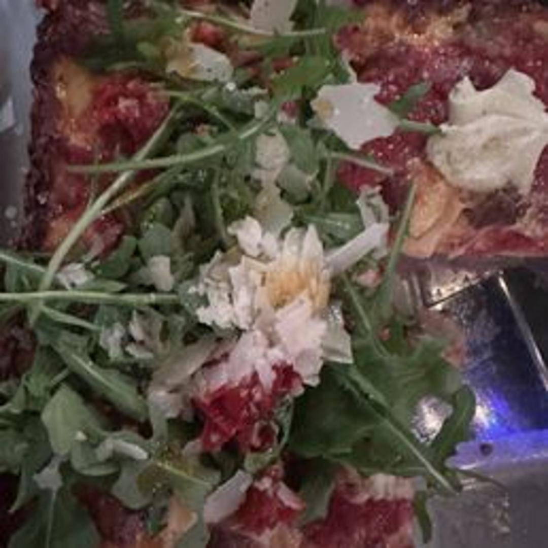 Detroit-style pizza featuring a blend of brick, white cheddar and mozzarella cheeses, spicy soppressata, calabrian chili peppers, and a drizzle of chili oil.