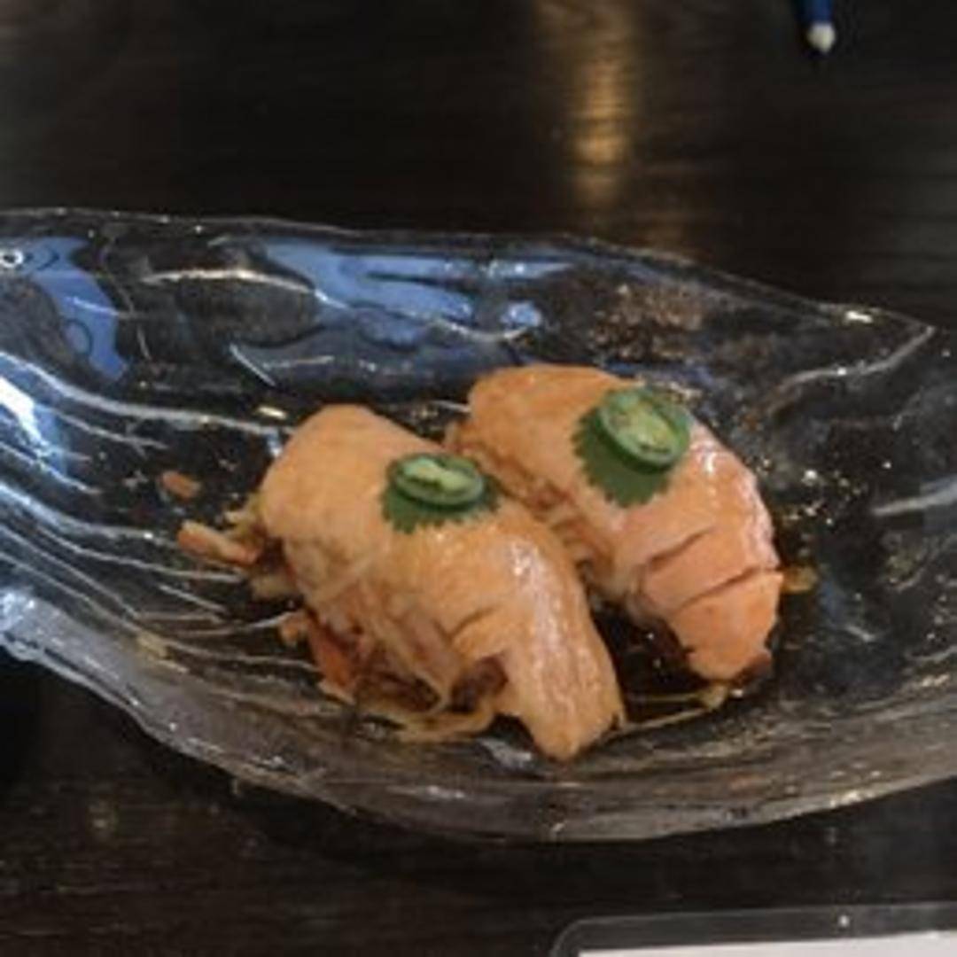 Salmon, crab mix, cream cheese, spicy mayo, masago arare, and eel sauce.