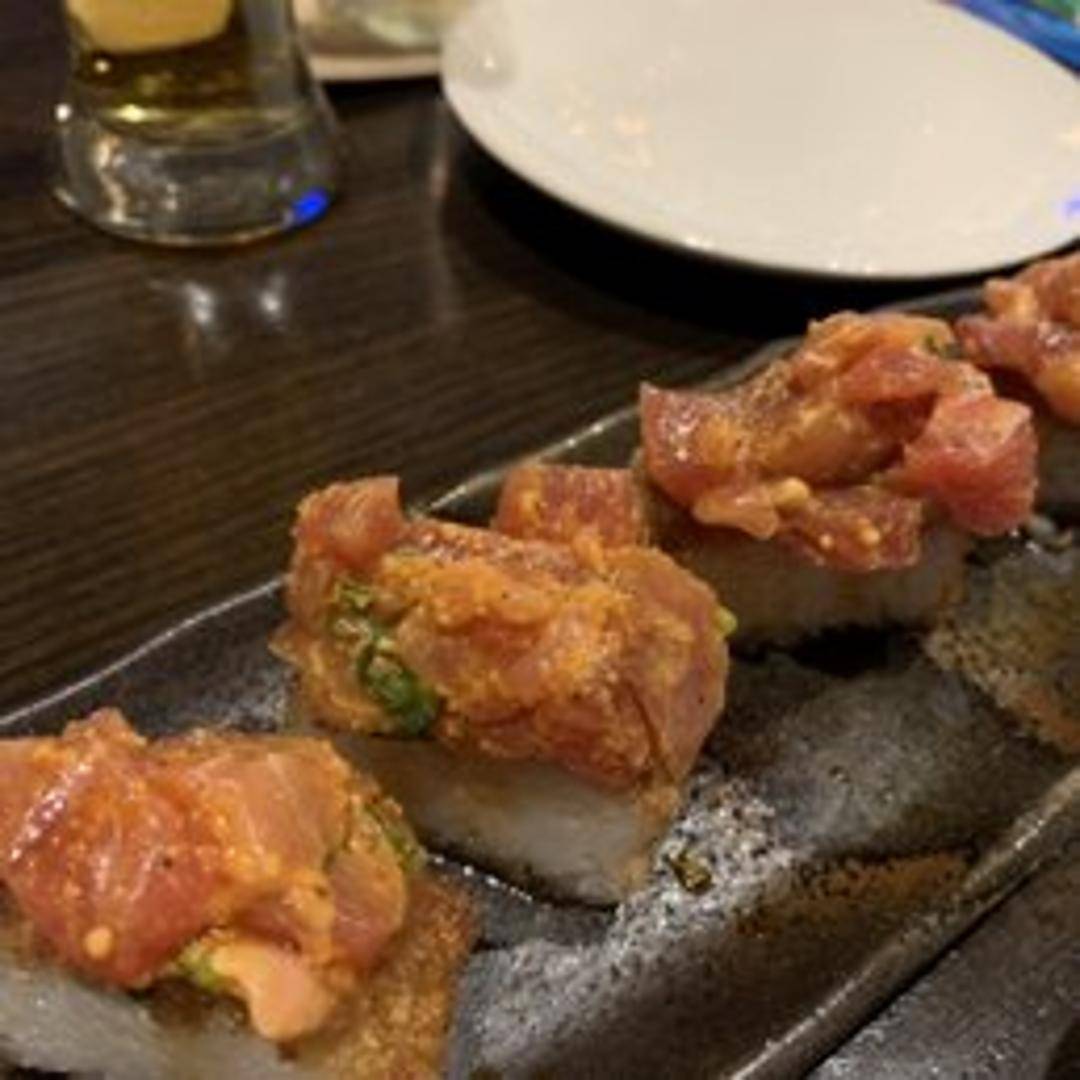 Spicy tuna, crab mix, avocado, and sweet chili sauce on a crispy rice cake.