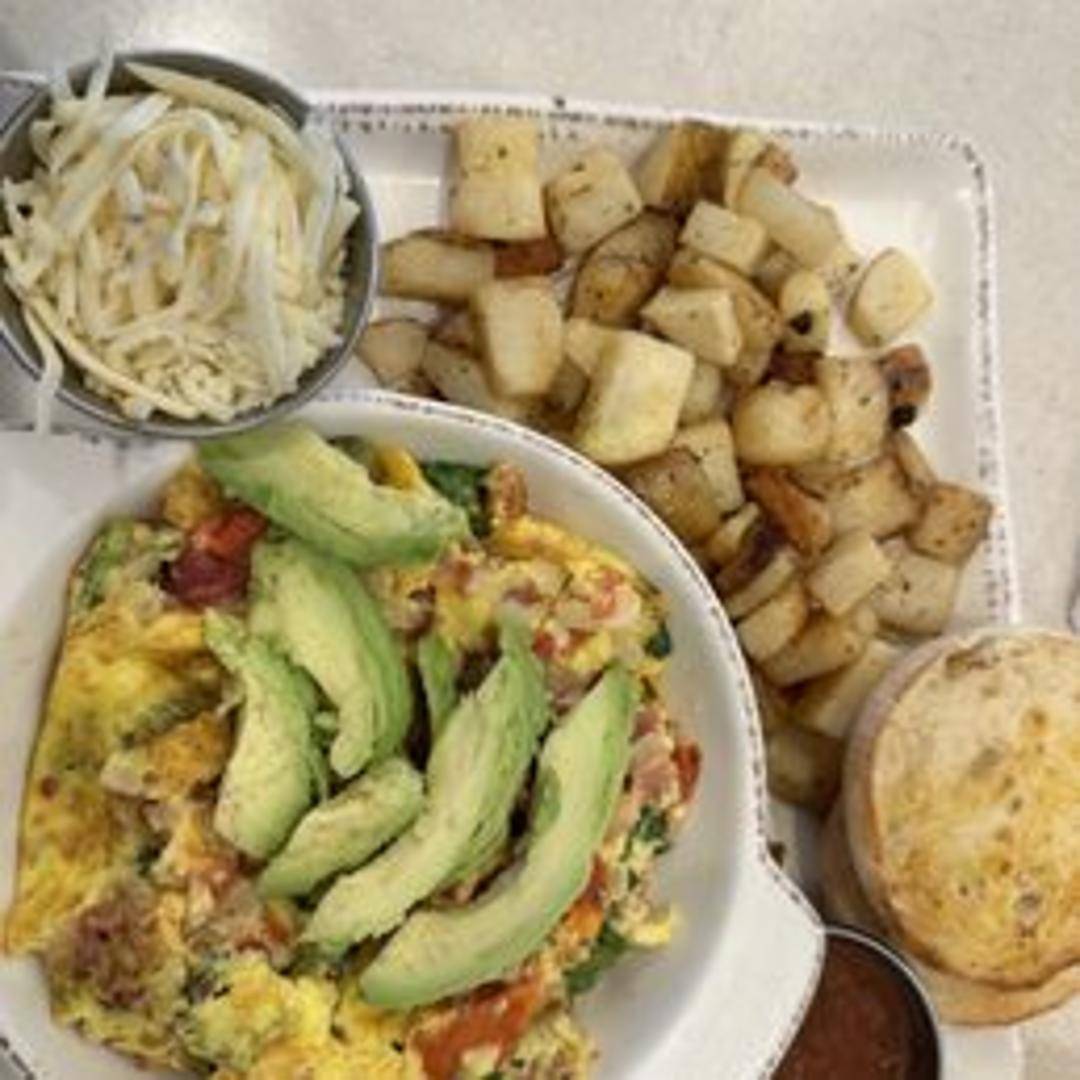 A delicious scramble featuring crispy bacon and creamy avocado. Details depend on the specific recipe but may include cheese, onions, and peppers.