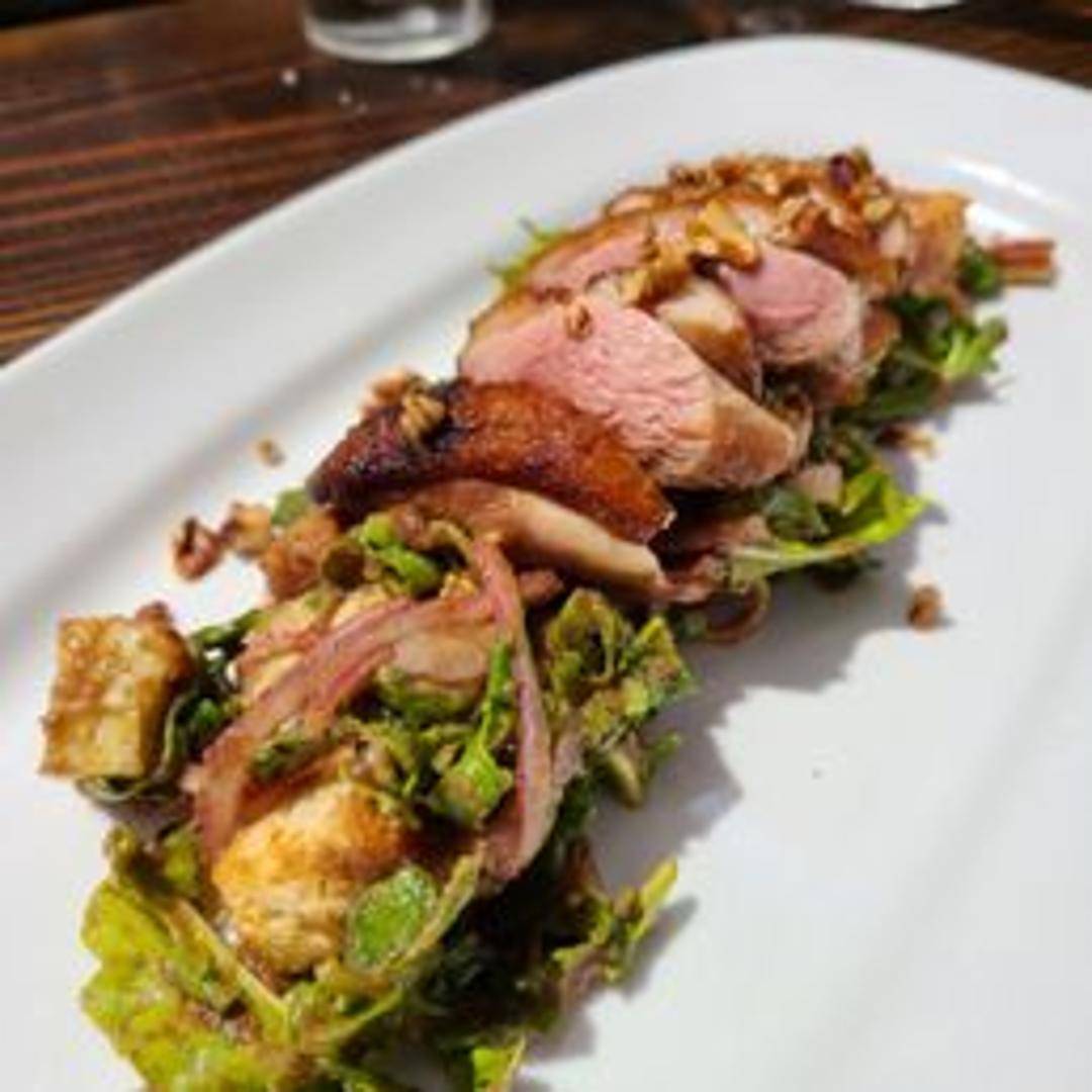 Pan-seared Maple Leaf Farms duck breast prepared with seasonal accompaniments and a complementing sauce.