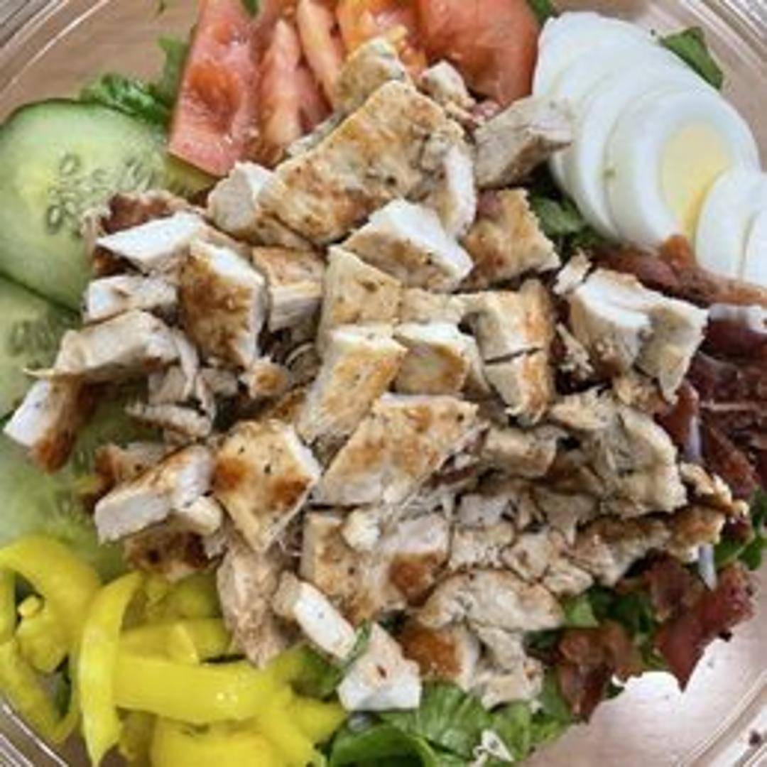 A hearty salad with grilled chicken, bacon, avocado, hard-boiled egg, tomatoes, and blue cheese crumbles on a bed of mixed greens. Choice of dressing.