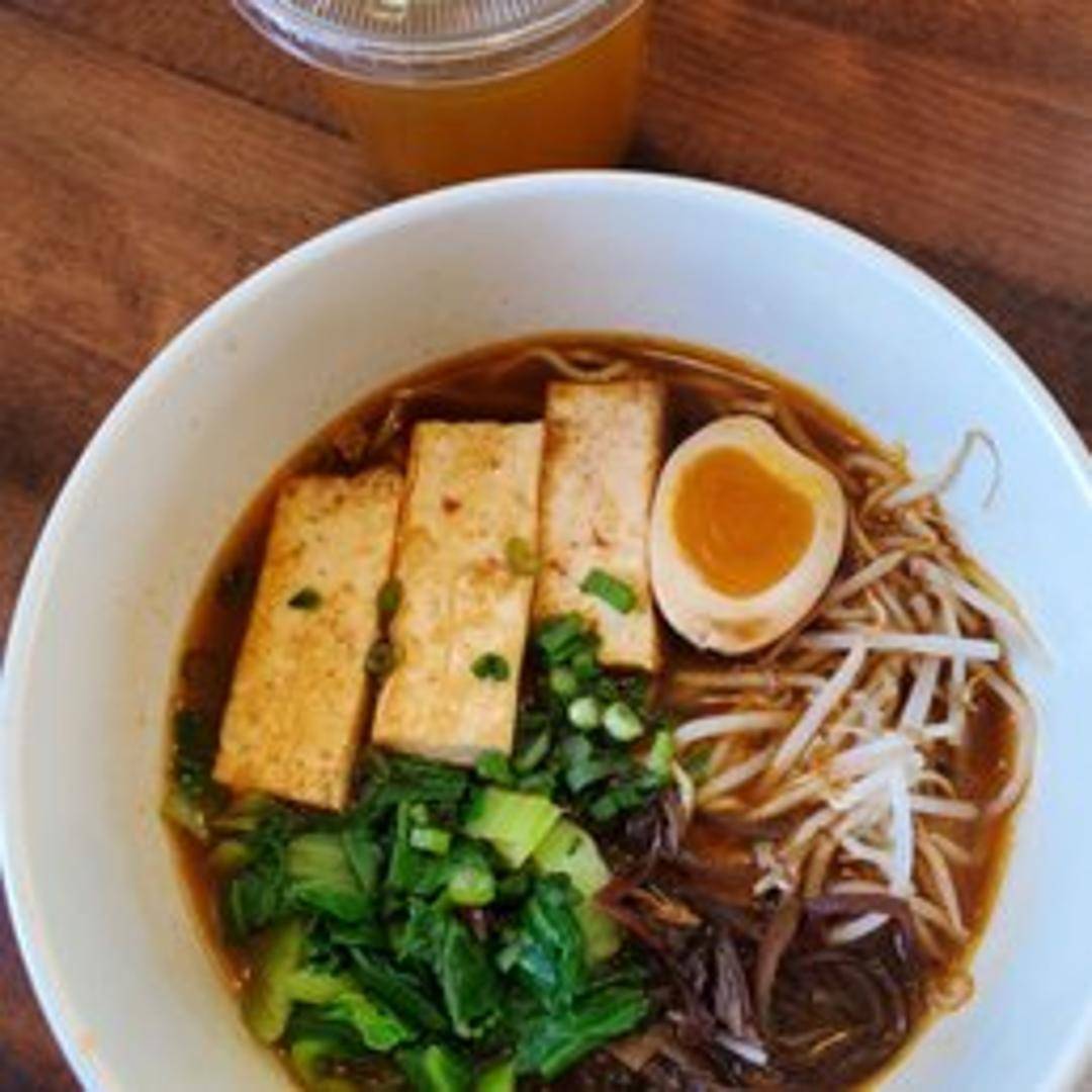 Flavorful broth brimming with fresh, seasonal vegetables, wheat noodles, soft-boiled egg, and seaweed. A vegetarian-friendly take on classic ramen.