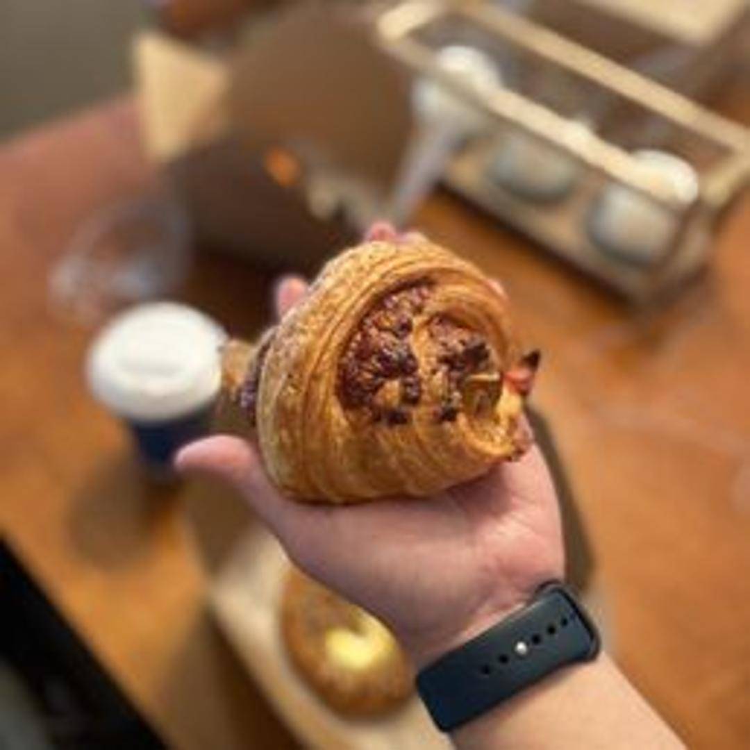 A savory croissant filled with thinly sliced ham and melted cheese. The croissant dough is baked to a golden brown, offering a delicate and buttery flavor that complements the savory ham and cheese filling.