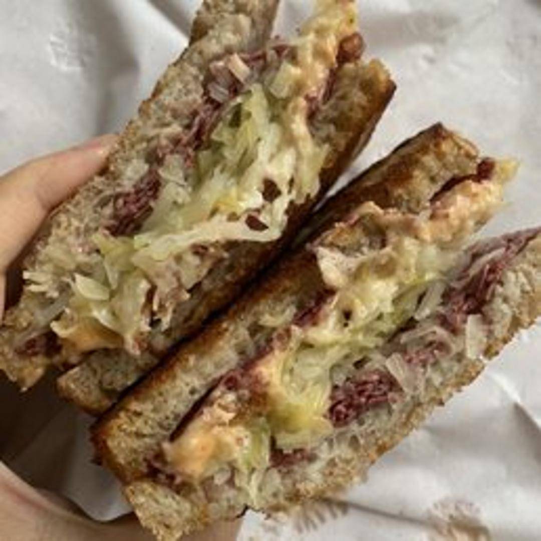 Classic Reuben sandwich featuring corned beef, sauerkraut, Swiss cheese, and Russian dressing, grilled to perfection on rye bread.
