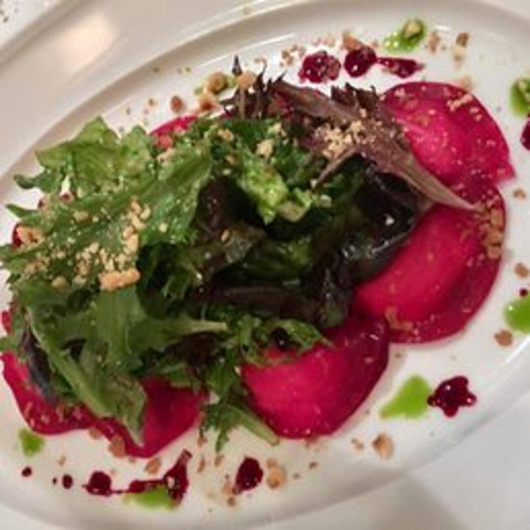 A vibrant and refreshing salad showcasing an assortment of tender, earthy roasted beets. Complemented by creamy goat cheese, crunchy candied walnuts, and crisp, fresh greens, all lightly tossed in a bright, zesty vinaigrette for a harmonious balance of flavors and textures.