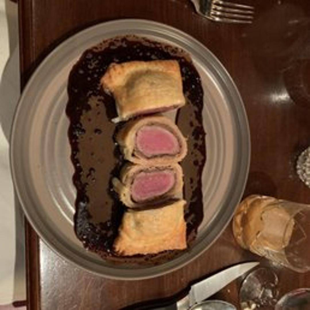A timeless culinary masterpiece, featuring a perfectly seared beef tenderloin, enveloped in a savory mushroom duxelles and delicate prosciutto, all encased in a golden, flaky puff pastry. Baked to perfection and served with a rich, aromatic sauce.