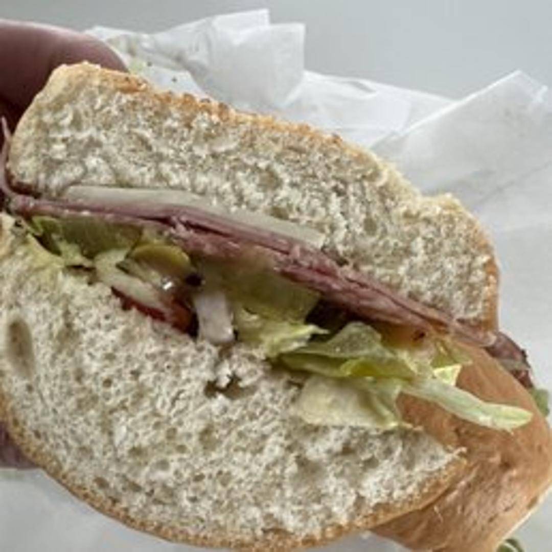 A hearty sandwich featuring a selection of premium Italian deli meats such as salami, capicola, and mortadella, layered with provolone cheese, lettuce, tomato, onion, and a tangy vinaigrette dressing on a crusty Italian roll.