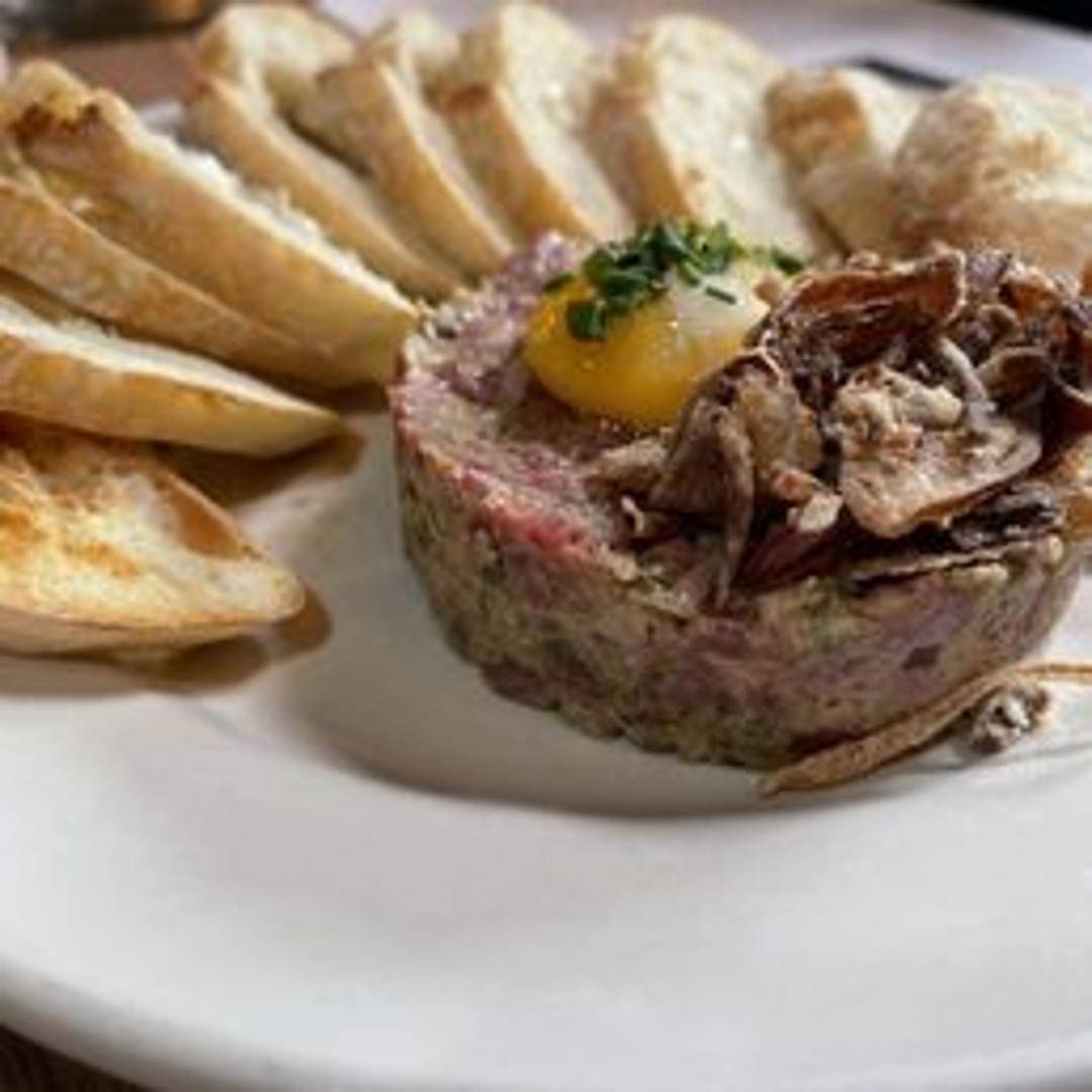 Finely chopped raw steak mixed with traditional seasonings, capers, onions, and a raw egg yolk. Served with toasted bread.