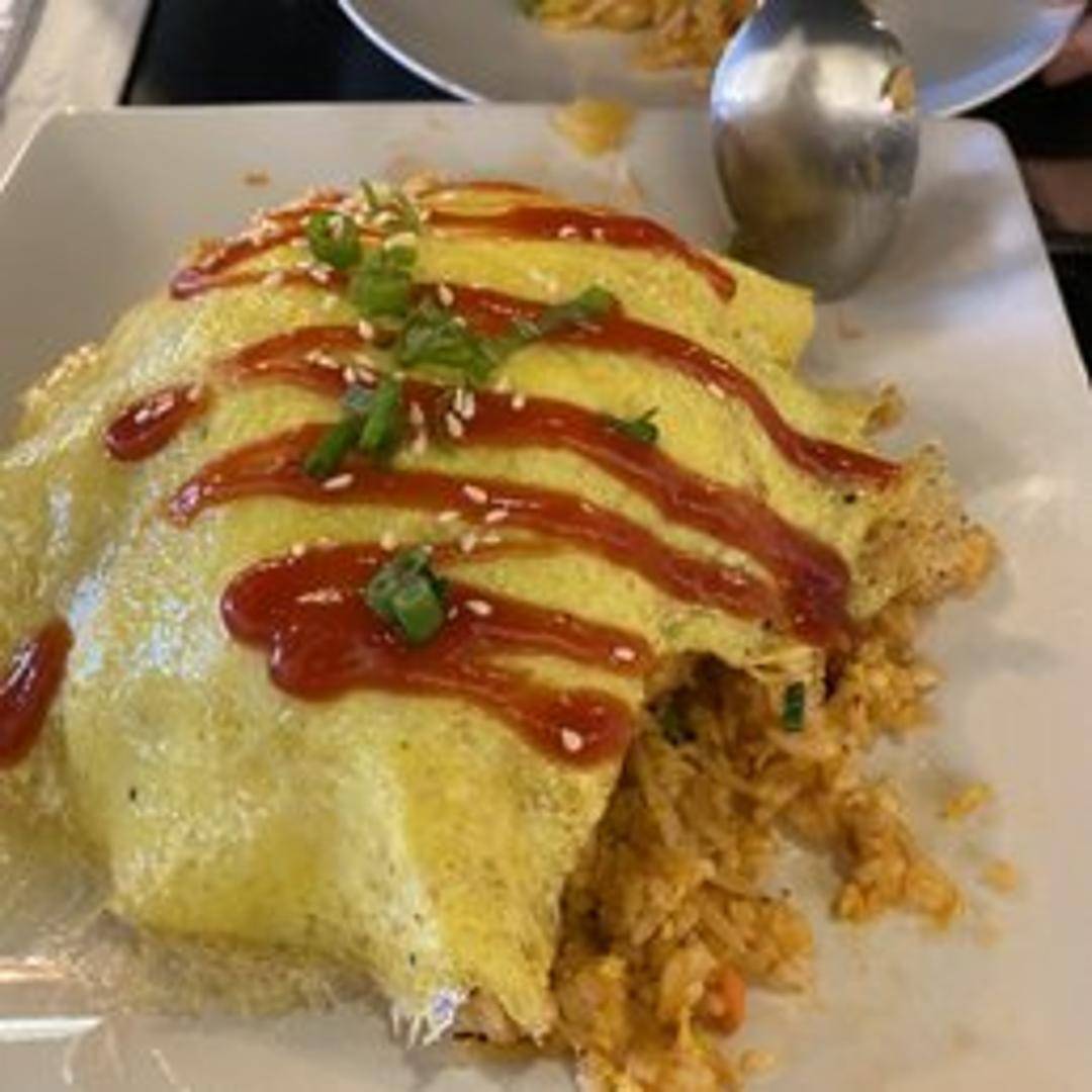 Fluffy Japanese omelet filled with savory fried rice, drizzled with a tangy and sweet sauce.