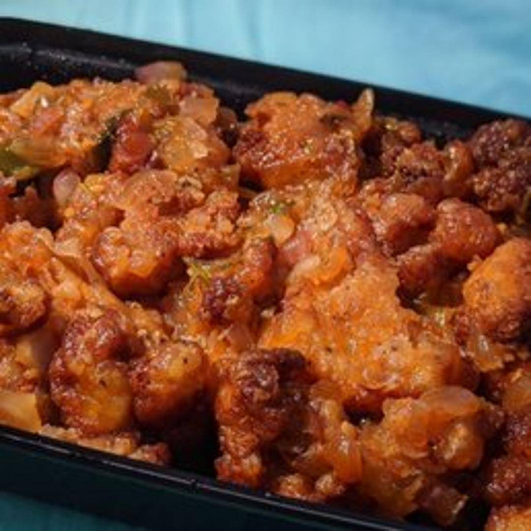 A popular Indo-Chinese fusion dish, featuring crispy battered and fried cauliflower florets tossed in a distinctive spicy, sweet, and tangy sauce. The sauce is typically made with soy sauce, vinegar, ginger, garlic, and green chilies, offering a unique blend of flavors. It can be served dry as an appetizer or with a light gravy as a main course.