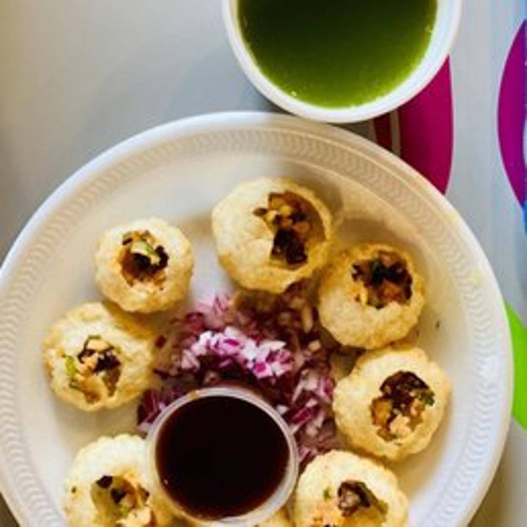 An iconic Indian street food sensation, consisting of small, crispy, hollow puris (fried semolina or wheat balls) filled with a mixture of spiced mashed potatoes or chickpeas. Each puri is then filled with a refreshing, tangy, and spicy watery mixture called 'pani,' flavored with tamarind, mint, green chilies, and various spices, designed to be enjoyed in a single, explosive bite.