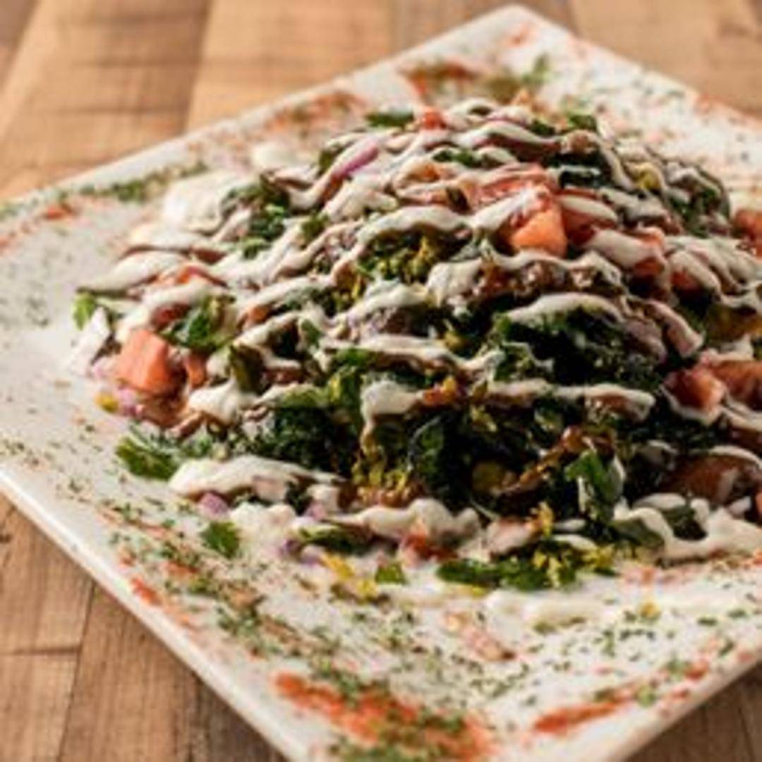 A unique and delicious street food snack featuring crispy fried spinach leaves as its base. The delicate palak pakoras are topped generously with cool yogurt, tangy tamarind chutney, spicy green chutney, a sprinkle of chaat masala, and garnished with fresh pomegranate seeds. It's a harmonious blend of crispy, creamy, sweet, and spicy notes.